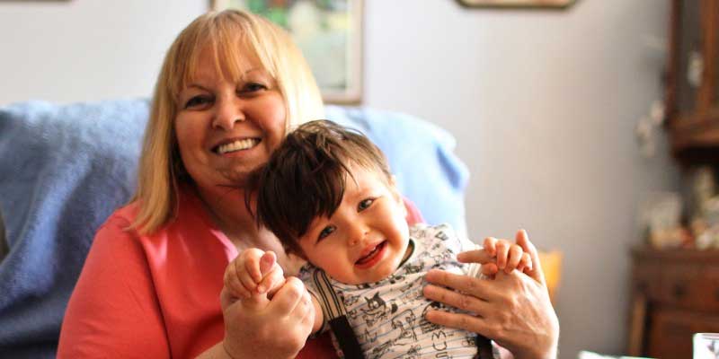 Pretty blond woman with bangs in a coral coloured t-shirt, smiling while trying to hold onto a cranky toddler.